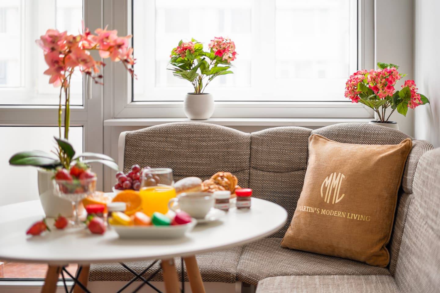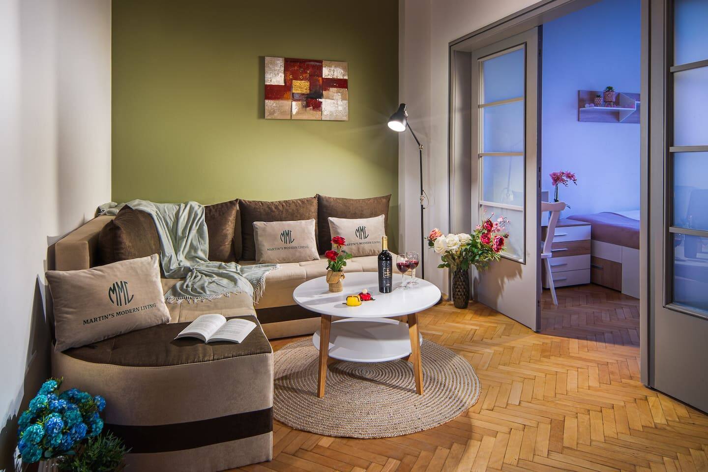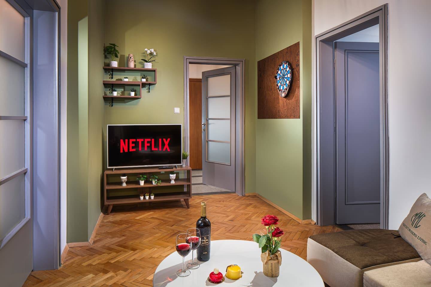 Experience the modern and elegant touches throughout the apartment as it has just been renovated in March 2023. When you enter the apartment, you will immediately notice the astonishing 3 meters 𝐡𝐢𝐠𝐡 𝐜𝐞𝐢𝐥𝐢𝐧𝐠𝐬 that are common for the high-end homes. . . 𝐋𝐈𝐕𝐈𝐍𝐆 𝐑𝐎𝐎𝐌 Relax in the cosy & airy living room that will turn into your favorite part of the apartment and your best choice for evening entertainment if you decide to stay home for the night. At night you can create the ultimate movie night and you can completely immerse yourself in a favorite movie while munching on sweet and salty snacks! Experience the 𝐮𝐥𝐭𝐫𝐚-𝐟𝐚𝐬𝐭 𝐖𝐢-𝐅𝐢 – up to 300 mbps speed and 𝟓 𝐆𝐇𝐳 𝐧𝐞𝐭𝐰𝐨𝐫𝐤! . .